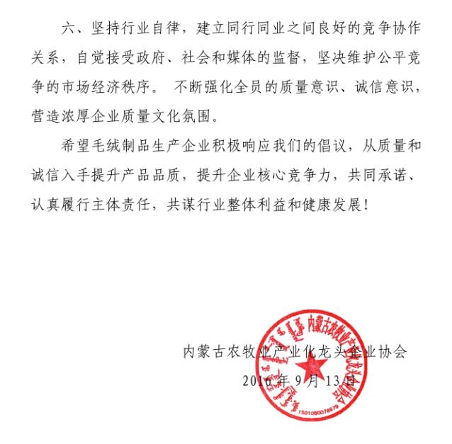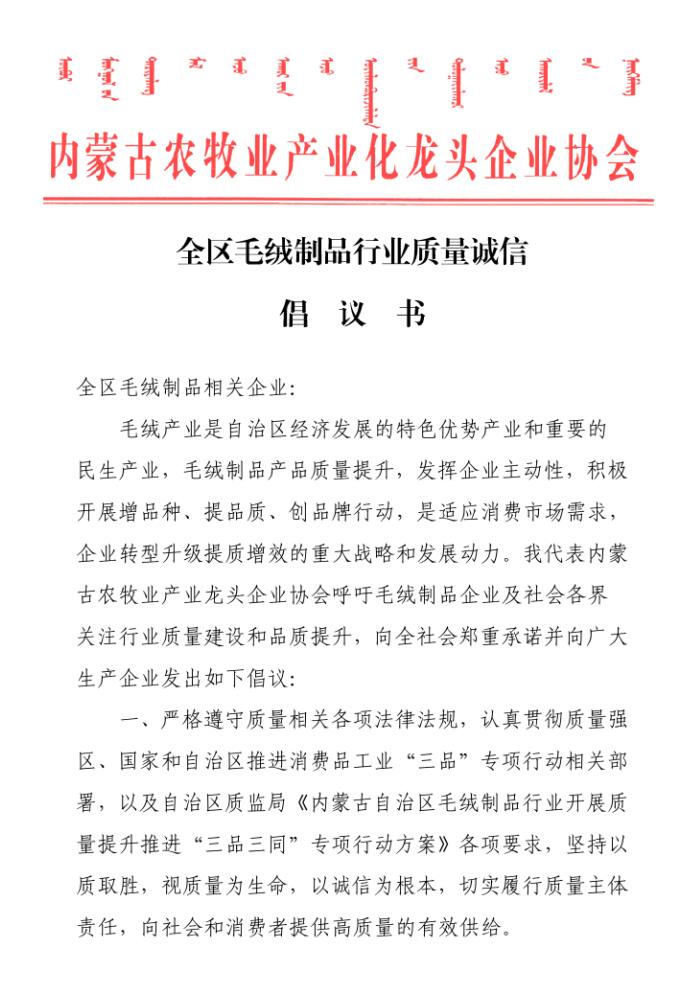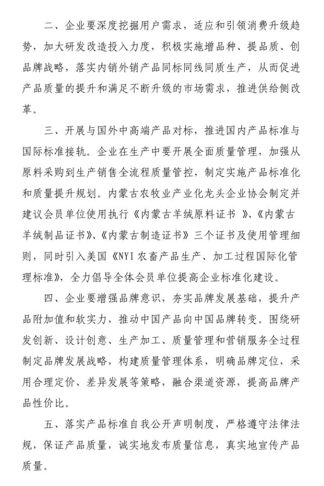 會上,質(zhì)監(jiān)局質(zhì)量監(jiān)督處副處長艾繼青宣讀國務(wù)院辦公廳《關(guān)于開展消費(fèi)品工業(yè)“三品”專項(xiàng)行動營造良好市場環(huán)境的若干意見》;孫磐處長向與會人員通報了近年羊絨監(jiān)督抽查的質(zhì)量狀況基本情況,并傳達(dá)了內(nèi)蒙古質(zhì)監(jiān)局印發(fā)的毛絨制品行業(yè)質(zhì)量提升推進(jìn)“三品三同”專項(xiàng)行動方案;纖維檢驗(yàn)局總工程師曹渭芳介紹了纖檢局助力企業(yè)產(chǎn)品質(zhì)量提升檢驗(yàn)?zāi)芰Φ姆?wù)舉措;協(xié)會副會長、羊絨分會名譽(yù)會長單位鄂爾多斯羊絨集團(tuán),協(xié)會副會長、內(nèi)蒙古鹿王羊絨制品有限公司及內(nèi)蒙古豐蒂妮羊絨制品有限公司三家企業(yè)相關(guān)負(fù)責(zé)人介紹了各自企業(yè)在落實(shí)國家和自治區(qū)羊絨產(chǎn)業(yè)政策、加快企業(yè)轉(zhuǎn)型升級和產(chǎn)品質(zhì)量提升方面的先進(jìn)經(jīng)驗(yàn);內(nèi)蒙古農(nóng)牧業(yè)產(chǎn)業(yè)化龍頭企業(yè)協(xié)會常務(wù)秘書長劉俊青代表行業(yè)協(xié)會向全區(qū)毛絨制品相關(guān)企業(yè)發(fā)起全區(qū)毛絨制品行業(yè)誠信倡議書,呼吁毛絨制品企業(yè)從質(zhì)量和誠信入手,提升產(chǎn)品品質(zhì),提升企業(yè)核心競爭力,認(rèn)真履行責(zé)任,共同推進(jìn)行業(yè)整體利益和健康發(fā)展。