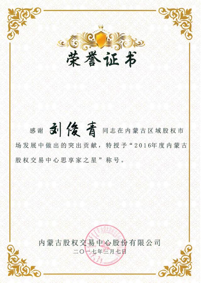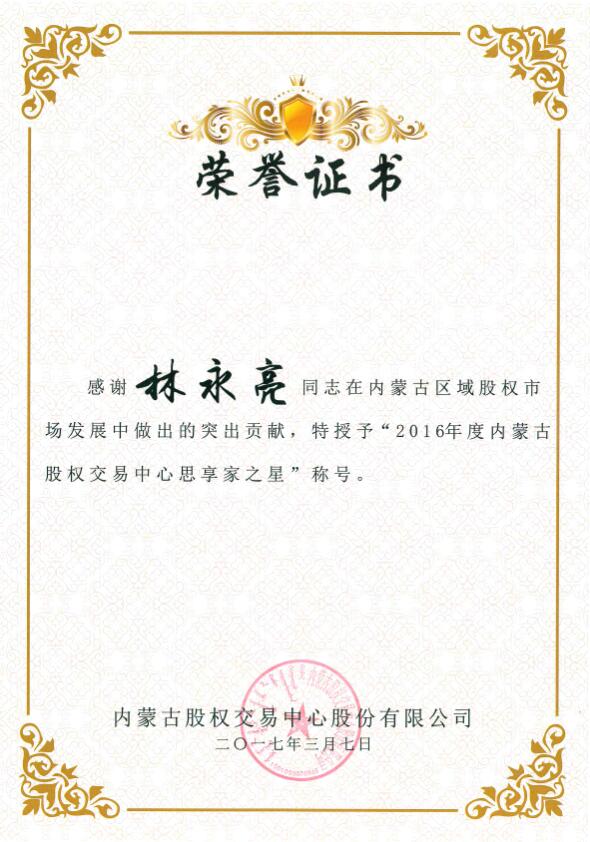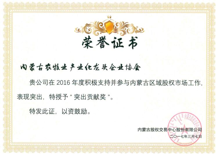 在37日上午召開的首屆內(nèi)蒙古股權(quán)交易中心會員和分支機(jī)構(gòu)大會上,內(nèi)蒙古農(nóng)牧業(yè)產(chǎn)業(yè)化龍頭企業(yè)協(xié)會因積極支持并參與內(nèi)蒙古區(qū)域股權(quán)市場工作,榮獲內(nèi)蒙古股權(quán)交易中心頒發(fā)的“突出貢獻(xiàn)獎”,協(xié)會執(zhí)行會長兼秘書長林永亮及常務(wù)秘書長劉俊青均榮獲“內(nèi)蒙古股權(quán)交易中心思享家之星”稱號。這是對協(xié)會在2016年對內(nèi)蒙古區(qū)域股權(quán)市場發(fā)展中突出貢獻(xiàn)的肯定,更是承載著一份責(zé)任和希望,新的一年,內(nèi)蒙古農(nóng)牧業(yè)產(chǎn)業(yè)化龍頭企業(yè)協(xié)會將繼續(xù)秉承“溝通 服務(wù) 自律 發(fā)展”的服務(wù)宗旨,乘勢而上,加壓奮進(jìn),開拓創(chuàng)新,找準(zhǔn)協(xié)會工作與股權(quán)經(jīng)濟(jì)建設(shè)的結(jié)合點(diǎn),為推動農(nóng)牧業(yè)產(chǎn)業(yè)化發(fā)展做出新的貢獻(xiàn)。