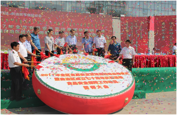 參會(huì)領(lǐng)導(dǎo)擂響慶祝自治區(qū)成立70周年食品安全保障的巨鼓