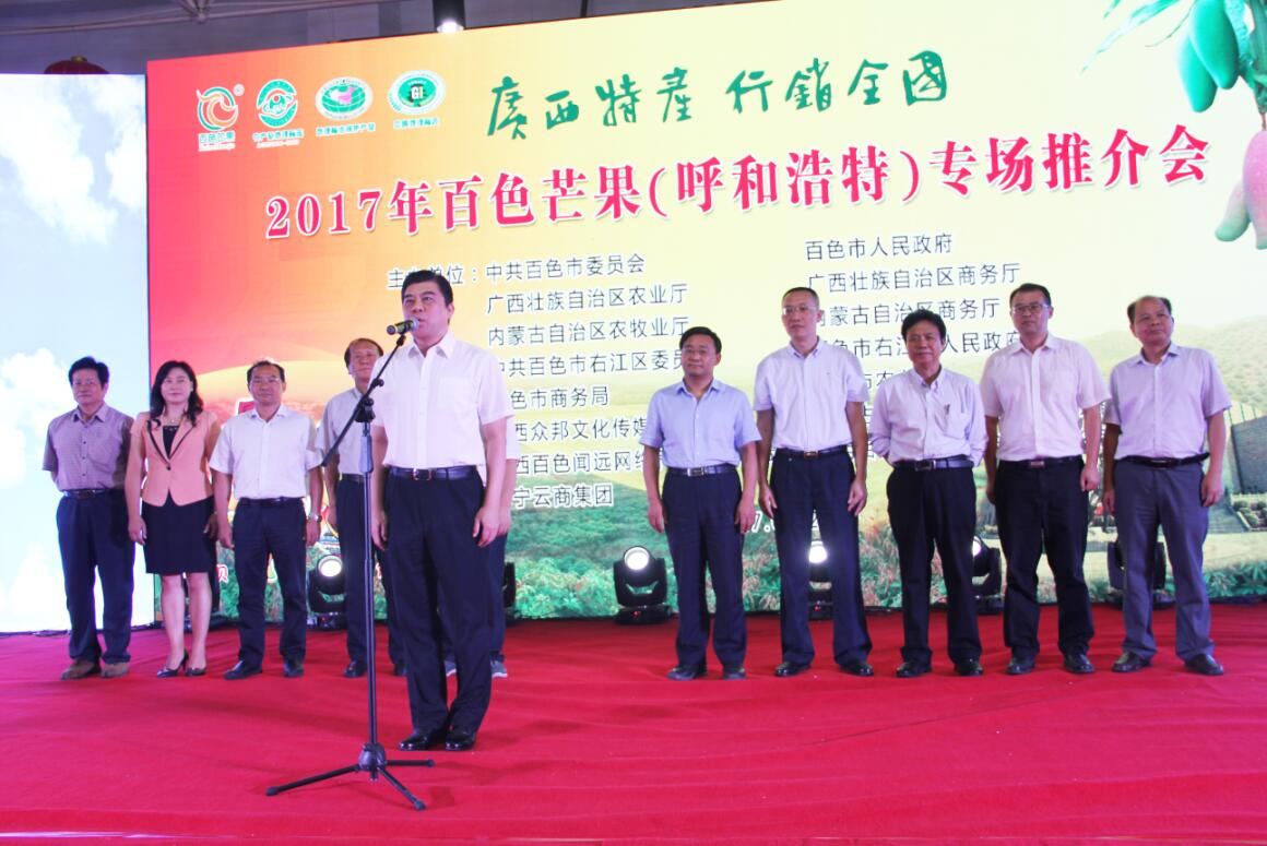 7月27日上午,由中共百色市委員會、百色市人民政府、內(nèi)蒙古自治區(qū)農(nóng)牧業(yè)廳、內(nèi)蒙古自治區(qū)商務(wù)廳、廣西壯族自治區(qū)商務(wù)廳、廣西壯族自治區(qū)農(nóng)業(yè)廳主辦的2017年百色芒果專場推介會在協(xié)會會員單位、內(nèi)蒙古食全食美集團(tuán)美通食品批發(fā)市場內(nèi)蒙古農(nóng)畜產(chǎn)品展銷大廳舉行。百色市委副書記、統(tǒng)戰(zhàn)部部長楊春庭在推介會上宣布活動正式啟動,內(nèi)蒙古自治區(qū)農(nóng)牧業(yè)廳副廳長劉永志、百色市政協(xié)副主席韋曉東等領(lǐng)導(dǎo)出席推介會,有關(guān)特邀嘉賓、百色市、縣有關(guān)部門代表、內(nèi)蒙古自治區(qū)有關(guān)部門、呼和浩特市有關(guān)部門負(fù)責(zé)人、客商代表、新聞媒體等參加會議。