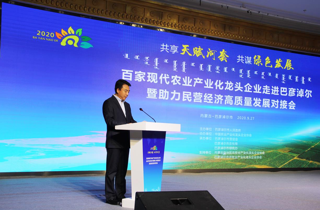 9月27日,由巴彥淖爾市人民政府主辦,中國農(nóng)業(yè)產(chǎn)業(yè)化龍頭企業(yè)協(xié)會協(xié)辦,巴彥淖爾市貿(mào)促會、巴彥淖爾市農(nóng)牧局、巴彥淖爾市綠統(tǒng)辦承辦,內(nèi)蒙古農(nóng)牧業(yè)產(chǎn)業(yè)化龍頭企業(yè)協(xié)會、巴彥淖爾市農(nóng)牧業(yè)產(chǎn)業(yè)化龍頭企業(yè)協(xié)會支持,以“共享‘天賦河套’·共謀綠色發(fā)展”為主題的百家現(xiàn)代農(nóng)業(yè)產(chǎn)業(yè)化龍頭企業(yè)走進(jìn)巴彥淖爾暨助力民營經(jīng)濟(jì)高質(zhì)量發(fā)展對接會在巴彥淖爾市臨河區(qū)召開。中國農(nóng)業(yè)產(chǎn)業(yè)化龍頭企業(yè)協(xié)會會長劉身利,中國農(nóng)科院紀(jì)檢組組長史志國,內(nèi)蒙古自治區(qū)黨委巡視二組駐巴彥淖爾市優(yōu)化營商環(huán)境專項工作組副組長董躍飛,巴彥淖爾市委副書記、市長張曉兵,市人大常委會主任閆鵬,市委副書記、政法委書記李中增,市委常委孫艾芳、王志平出席會議,副市長任逸群作市情推介,內(nèi)蒙古農(nóng)牧業(yè)產(chǎn)業(yè)化龍頭企業(yè)協(xié)會會長周勇應(yīng)邀出席會議。