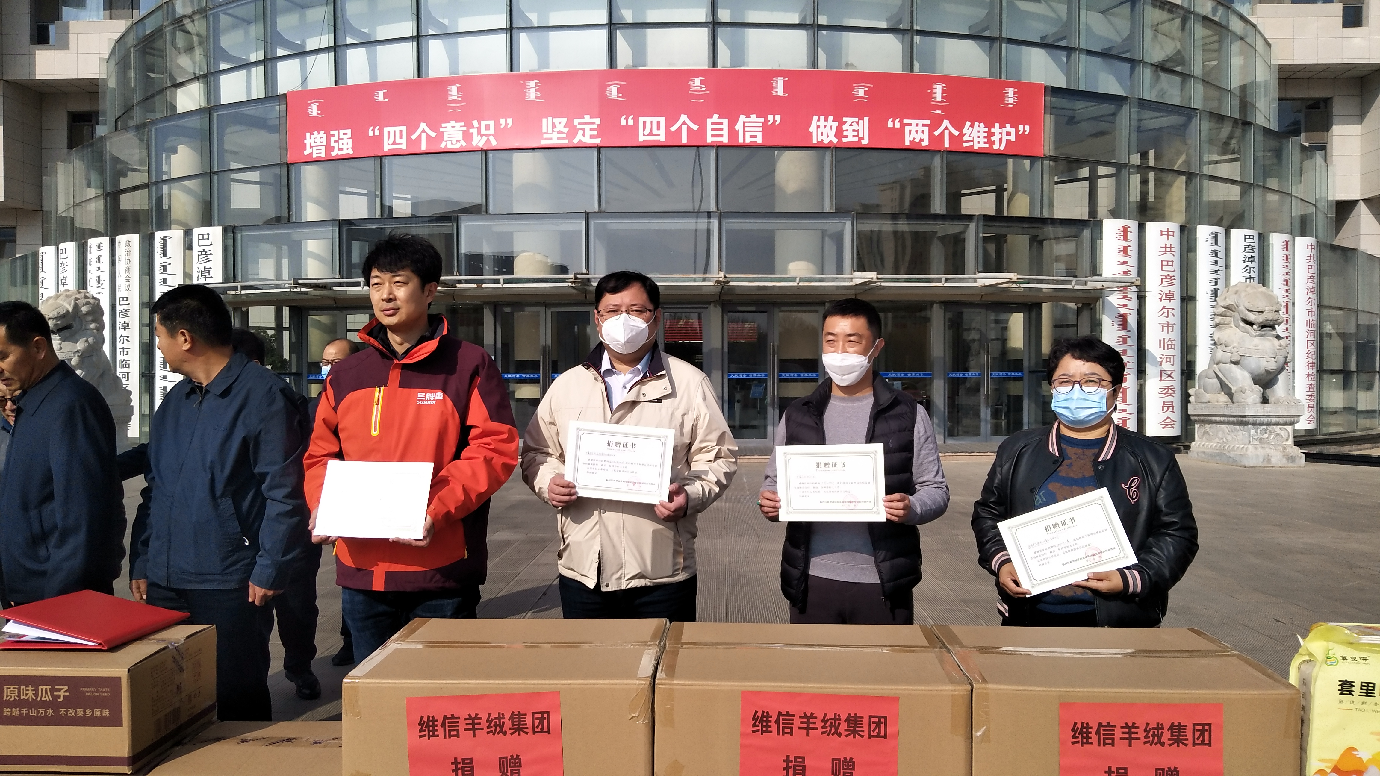 11月5日中午,維信羊絨集團(tuán)等7家會員單位向巴彥淖爾市臨河區(qū)抗疫捐贈物資,捐贈儀式在臨河區(qū)政府辦公樓前舉行,區(qū)委副書記、政法委書記陳海維參加活動并講話,對愛心企業(yè)的高尚情操給與了高度評價,區(qū)政協(xié)副主席劉浩主持了捐贈儀式。