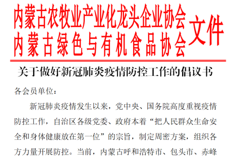 一、內(nèi)蒙古農(nóng)牧業(yè)產(chǎn)業(yè)化龍頭企業(yè)協(xié)會聯(lián)合內(nèi)蒙古綠色與有機(jī)食品協(xié)會,發(fā)布了《關(guān)于做好新冠肺炎疫情防控工作的倡議書》,引導(dǎo)各會員單位堅(jiān)決遏止借機(jī)囤積居奇、哄抬物價(jià)、虛假宣傳等破壞市場秩序、損害消費(fèi)者合法權(quán)益的不法行為,堅(jiān)決遏制疫情擴(kuò)展蔓延,積極投身新型冠狀病毒防控戰(zhàn)役中。