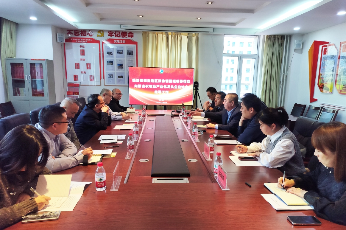2024年12月18日下午,自治區(qū)政協(xié)委員、港澳臺僑聯(lián)絡(luò)和外事委員會主任張波,內(nèi)蒙古工業(yè)大學(xué)僑聯(lián)副主席新巴雅爾,內(nèi)蒙古航空職業(yè)技術(shù)學(xué)校校長、內(nèi)蒙古航空運動協(xié)會會長趙自強,自治區(qū)政協(xié)港澳臺僑聯(lián)絡(luò)和外事委員會辦公室主任安勝利一行6人來協(xié)會調(diào)研指導(dǎo)工作,協(xié)會副會長單位內(nèi)蒙古凌志馬鈴薯科技股份有限公司總經(jīng)理閆洪志、內(nèi)蒙古民豐種業(yè)有限公司劉榮書,常務(wù)理事單位內(nèi)蒙古額爾敦羊業(yè)股分有限公司董事長助理畢欣及協(xié)會秘書處全體工作人員參加會議,會議由協(xié)會秘書長呼群主持。