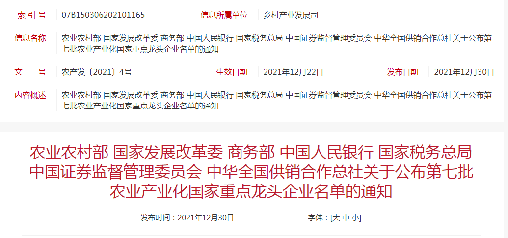 企業(yè)名稱:農(nóng)業(yè)農(nóng)村部 國家發(fā)展改革委 商務(wù)部 中國人民銀行 國家稅務(wù)總局 中國證券監(jiān)督管理委員會 中華全國供銷合作總社關(guān)于公布第七批農(nóng)業(yè)產(chǎn)業(yè)化國家重點(diǎn)龍頭企業(yè)名單的通知