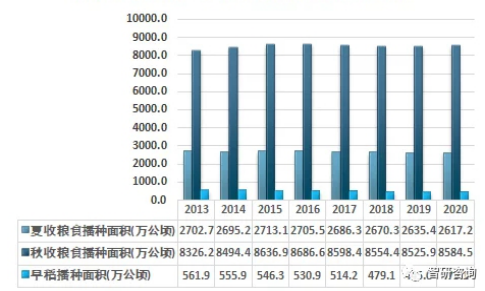 2020年全國糧食播種面積17.52億畝,比上年增加1056萬畝,增長0.6%;谷物播種面積14.69億畝,比上年增加176萬畝,增長0.1%;稻谷播種面積4.51億畝,比上年增加573萬畝,增長1.3%;豆類播種面積1.74億畝,比上年增加778萬畝,增長4.7%。受大豆振興計劃政策帶動,大豆播種面積1.48億畝,比上年增加825萬畝,增長5.9%。中國糧食生產(chǎn)再獲豐收,產(chǎn)量連續(xù)6年保持在1.3萬億斤以上,為扎實做好六穩(wěn)工作、全面落實六保任務,為應對復雜多變的國內(nèi)外環(huán)境、克服各種風險挑戰(zhàn),為全面建成小康社會、打贏脫貧攻堅戰(zhàn)提供了堅實的基礎。(數(shù)據(jù)來源:國家統(tǒng)計局、中商產(chǎn)業(yè)研究院整理)
